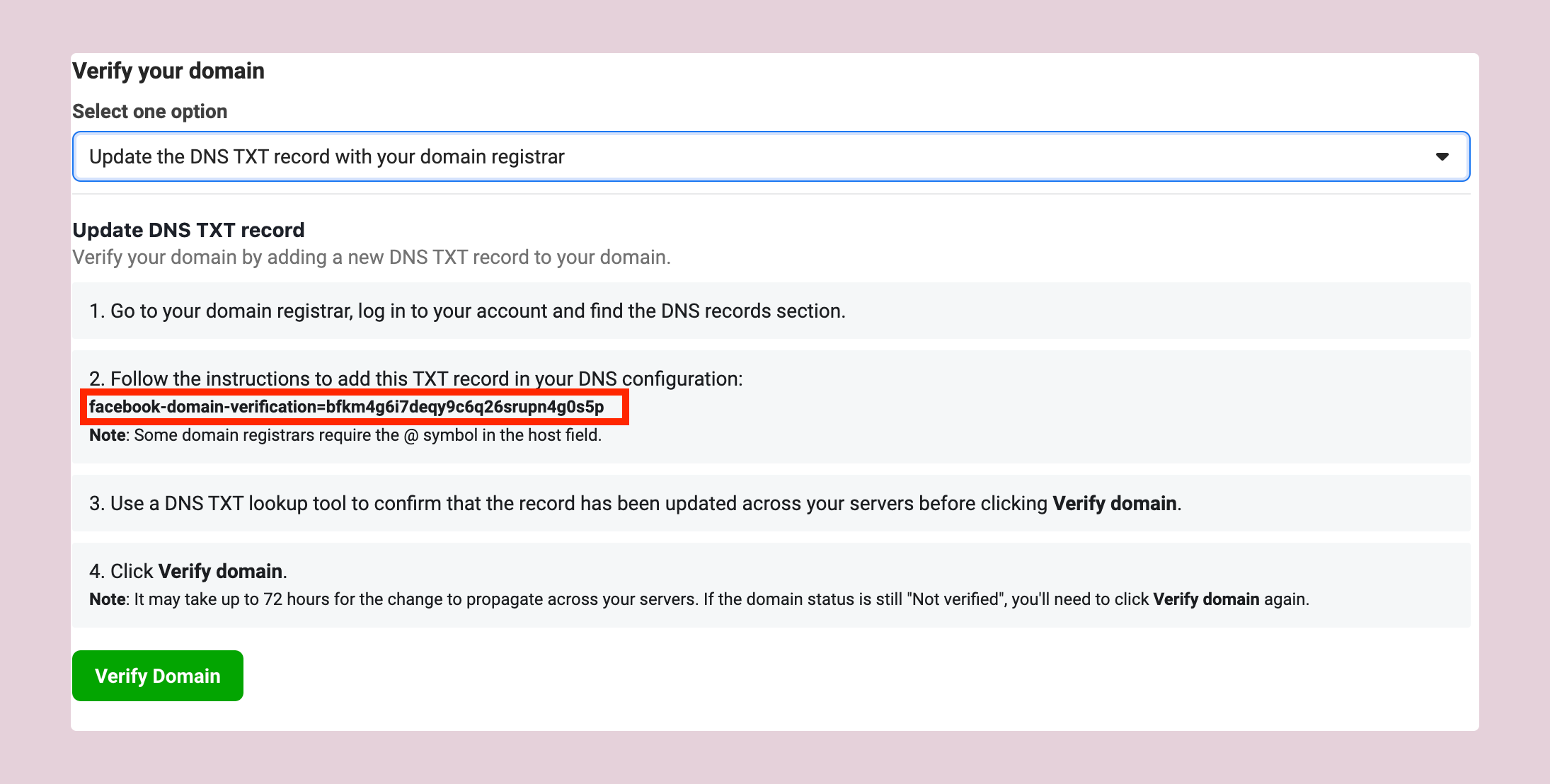 10. Når dette er lagt til kan du gå tilbake til Facebook Business Manager og klikke på den grønne “Verify Domain” knappen. Husk at det kan ta opp til 72 timer før domene innstillinger oppdateres over alt, men som regel går dette greit med en gang.